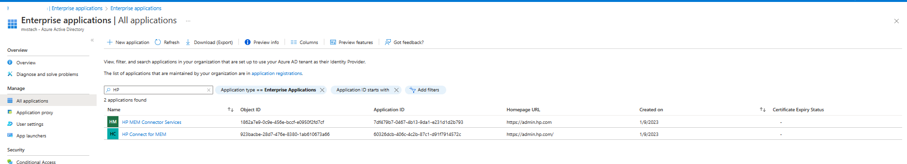 The applications related to HP Connect are registered in Azure