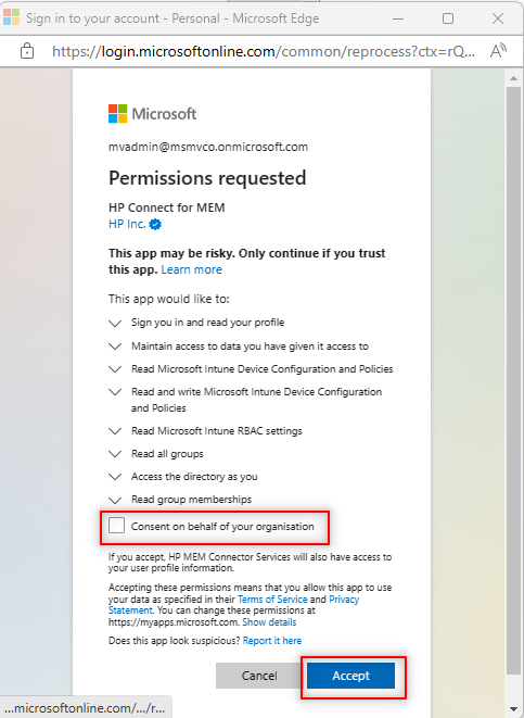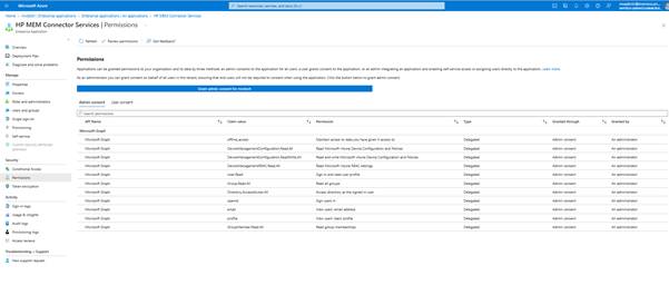 Consent to access the Entra ID information is required to create the HP Connect application in Azure.