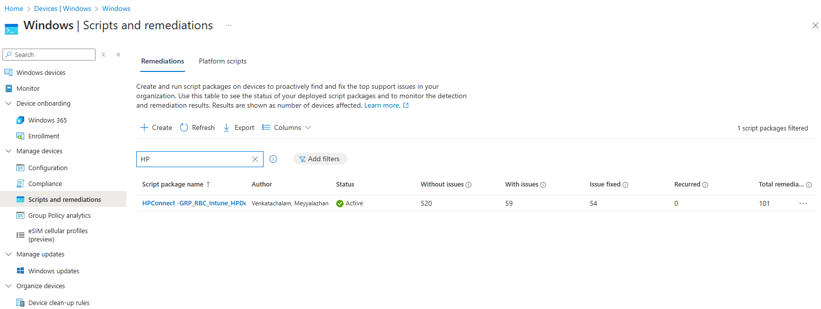 Upon the successful creation of the required BIOS settings and update configurations, the resulting rules will be listed under remediation scripts in Intune.