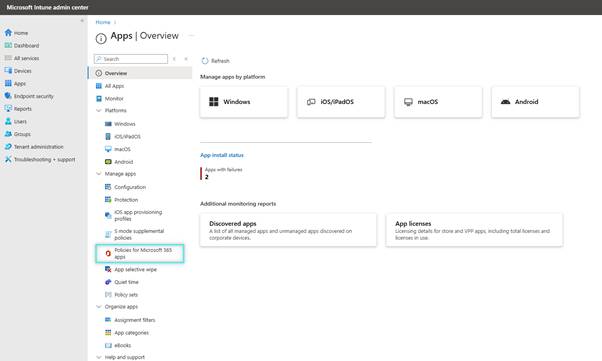 Go to Apps > Managed Apps > Policies for Microsoft 365 apps.
