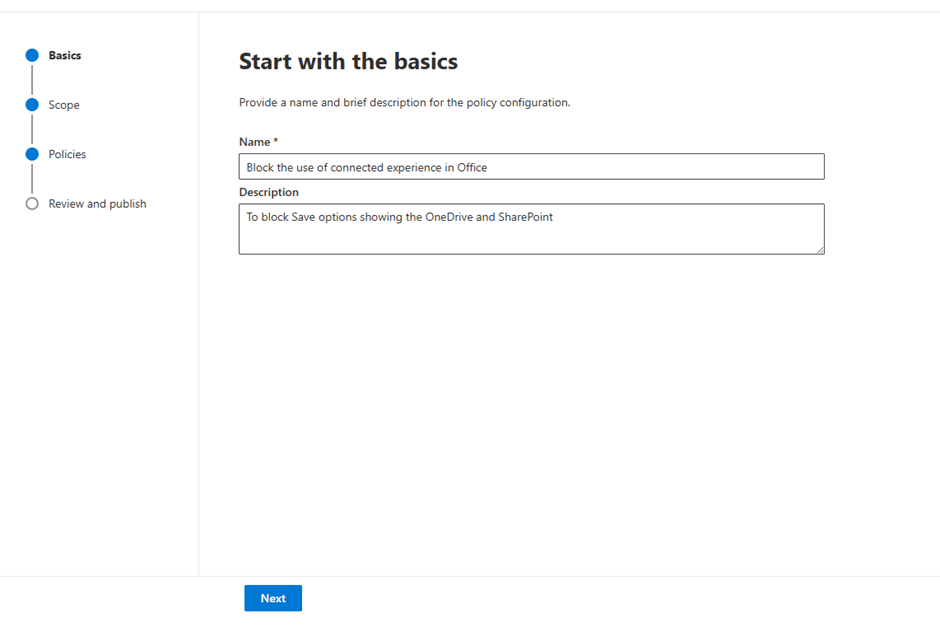 On the Basics tab, specify the name of the profile like Block the use of connected experience in Office, and add a profile description. Click Next.