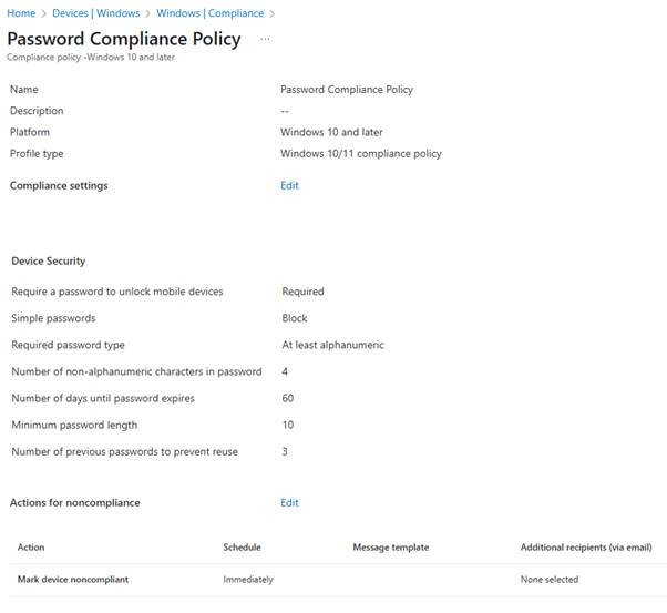 If a device does not meet these password requirements, it will be marked non-compliant, potentially restricting access to corporate resources through Conditional Access.