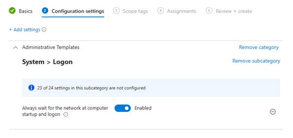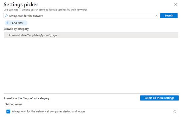| Intune / GPO Setting Name | Always wait for the network at computer startup and logon (Startup scripts run synchronously) | No wait setting needed — default behaviour. |