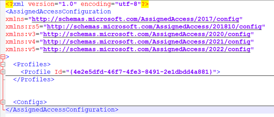 The <AssignedAccessConfiguration> element within an XML file defines the configuration for Assigned Access on Windows devices. It includes all the schemas used with the XML, Profiles, and Configs.