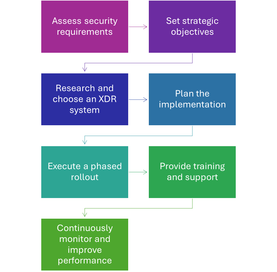 A successful XDR implementation can really enhance security and streamline operations across your enterprise. To get the most out of your XDR platform, it’s important to plan thoughtfully—starting with a clear strategy and regularly checking how well everything is working. Follow these simple steps to increase your chances of a smooth and successful XDR rollout.